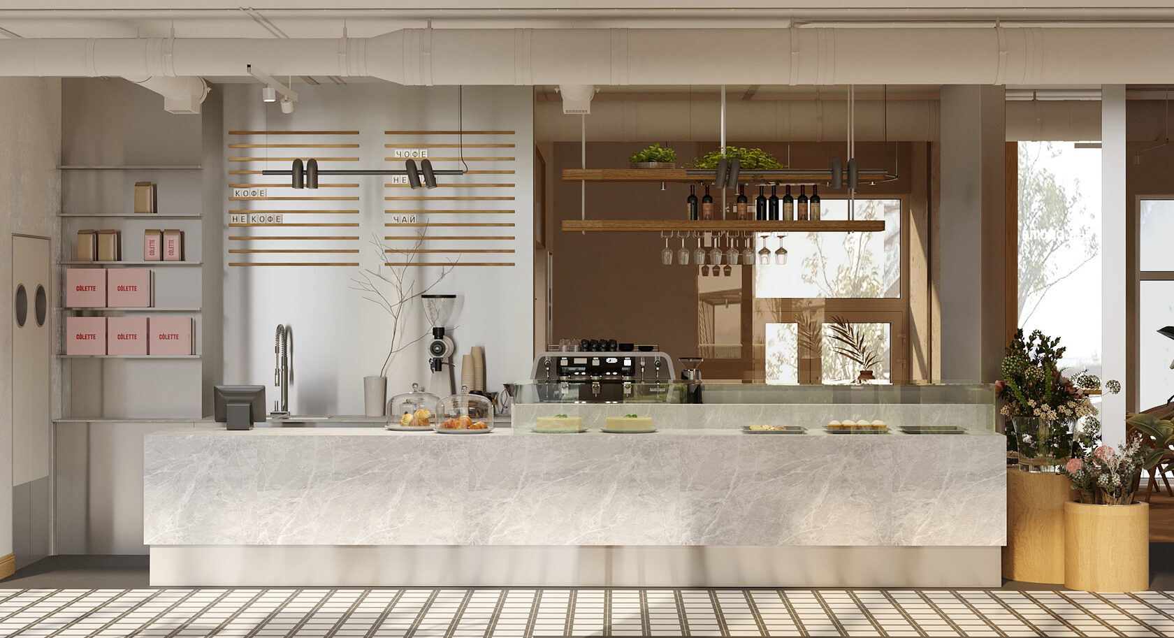 Проект кафе разрабатывался международной группой дизайнеров из Украины, Беларуси, России и США в рамках учебного курса школы SKVOT под руководством украинской дизайнерки Йовы Ягер. Интерьер выполнен в тёплой цветовой гамме с включением графических элементов, арта и применением разных типов отделки предпочтительной для использования в общественных интерьерах. Зона для утреннего кофе и завтраков наполнена венскими стульями - один из знаковых предметов мебели для парижских бистро. Одной из фокусных точек заведения служит рисунок с надписью на стене, выполненный из холодного неона. Вечерний зал с мягкой посадкой. Разные типы бокового освещения создают камерную и располагающую к долгим ужинам атмосферу. Пол входной группы отделан мозаикой из гексагонов белого и чёрного цвета.